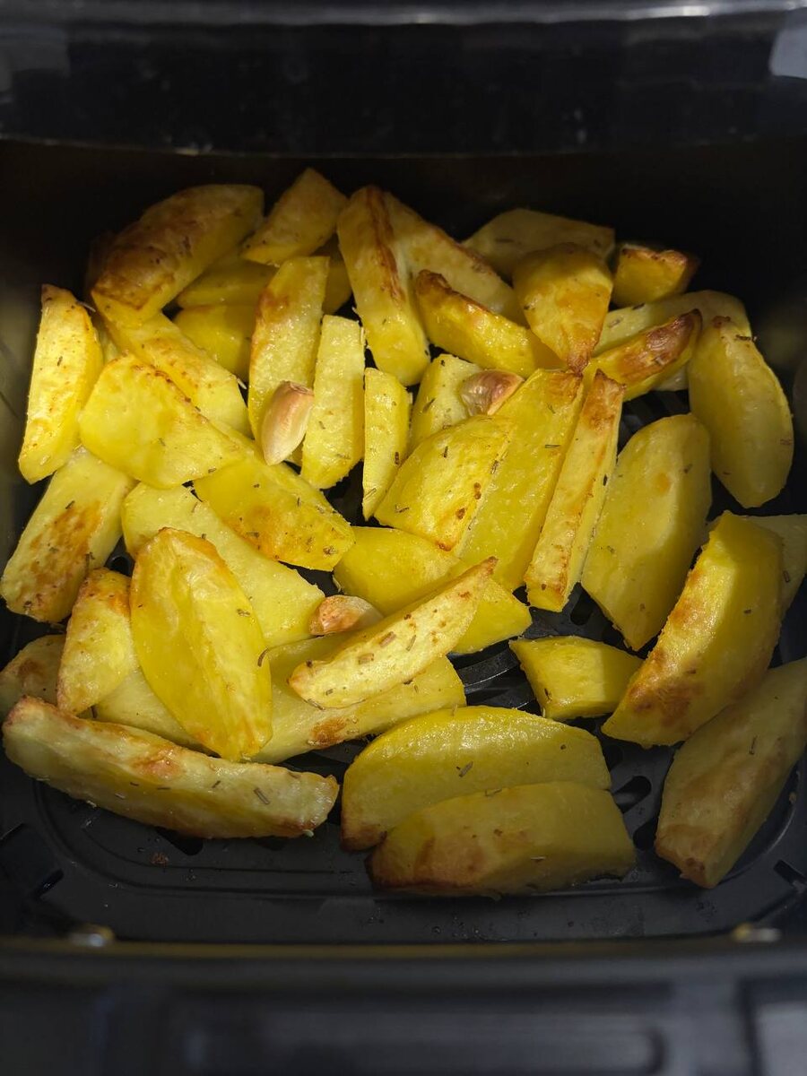 🥔 Картошка в аэрогриле: хрустящая корочка и нежный вкус! Идеальный рецепт для любителей вкусной и быстрой еды! Пищевая ценность на 100 г: Калории: ≈ 110-120 ккал Белки: 2 г Жиры: 5 г Углеводы: 15 г Ингредиенты: Картофель — 800 г (≈ 480 ккал) Масло авокадо — 1 ст. л. (≈ 120 ккал) Чеснок — 3 зубчика (≈ 12 ккал) Чесночный порошок — 0,5 ч. л. (≈ 2 ккал) Чёрный перец — по вкусу Соль — по вкусу Розмарин — 1/3 ч. л. (≈ 2 ккал) Общая калорийность блюда: ≈ 616 ккал Важный момент: для аэрогриля лучше выбирать картофель среднего размера с плотной кожурой. Он идеально подходит для запекания и даёт отличный результат! Приготовление в аэрогриле: Подготовка картофеля: Тщательно вымойте и очистите клубни Нарежьте дольками среднего размера Промокните бумажными полотенцами Маринад: Полейте маслом Добавьте специи и чеснок Тщательно перемешайте Запекание: Выложите на решётку аэрогриля в один слой Установите температуру 200°C Запекайте 10 минут Переверните картофель Уменьшите т