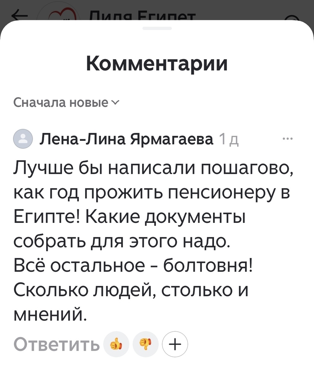 Вот такой комментарий сегодня я увидела под статьёй, которую писала больше года назад. А вот и сама статья. Я сейчас нахожусь в России и канал о Египте больше не веду, но этот комментарий меня так удивил, что я отвечу. @Лена-Лина Ярмагаева, никакие документы кроме загранпаспорта, пенсионеру для того чтобы жить в Египте ненужны. Прилетаете, покупаете визу в аэропорту, которая стоит 25 долларов, а с января (говорят) будет стоить 45. Снимаете квартиру от 200 долл в месяц минимально и выше... и живёте как хотите. Улетаете через 3 месяца - год: платите сбор в аэропорту около 120 долларов. Остаётесь — платите потом сразу за все годы пока это 120 за год. И ещё вам нужны деньги чтобы собственно жить, питаться, где-то отдыхать. Из расчёта 500 долларов на скромное житье. В Египте сейчас дорого. Всё дорого, кроме некоторых фруктов и овощей. Но я думаю, что Вам не стоит никуда ехать, лучше оставайтесь и сидите дома. Потому что у вас такой настрой, что вам будто обязаны что-то писать пошаг