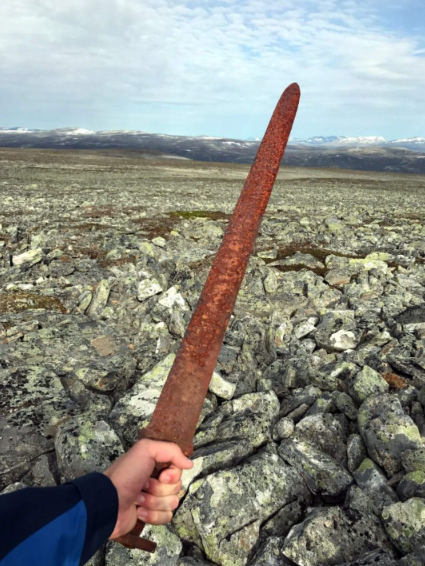 Мужчины отправились на охоту за северными оленями. Во время прогулки один случайно бросил взгляд вниз и обнаружил поразительную вещь: среди скал лежал меч эпохи викингов, которому было около 1200 лет. Состояние клинка поражало — несмотря на ржавчину, покрывавшую рукоять и лезвие, оружие сохранило свою целостность. От былого декора на рукояти ничего не осталось — вероятно, он был выполнен из недолговечных материалов, например, дерева или кожи. Когда охотники разместили снимок находки в социальных сетях, интерес к фотографии проявили учёные. К счастью, снимок был сделан на мобильный телефон, который зафиксировал GPS-координаты места обнаружения меча. Омбакк и его спутники смогли провести к месту находки, расположенному на высоте почти трёх километров над уровнем моря, специалистов: металлоискателя, археолога и исследователей из норвежской организации «Тайны льда», которая занимается изучением ледниковой археологии. Эксперты тщательно обследовали территорию площадью около 22 акров, но
