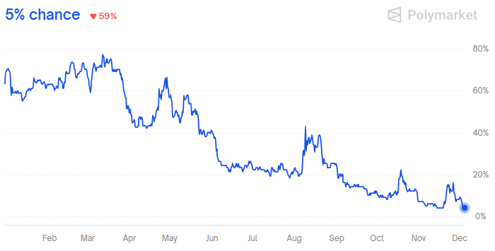 Polymarket: вероятность прекращения огня между Россией и Украиной до конца текущего года оценивается в 5%