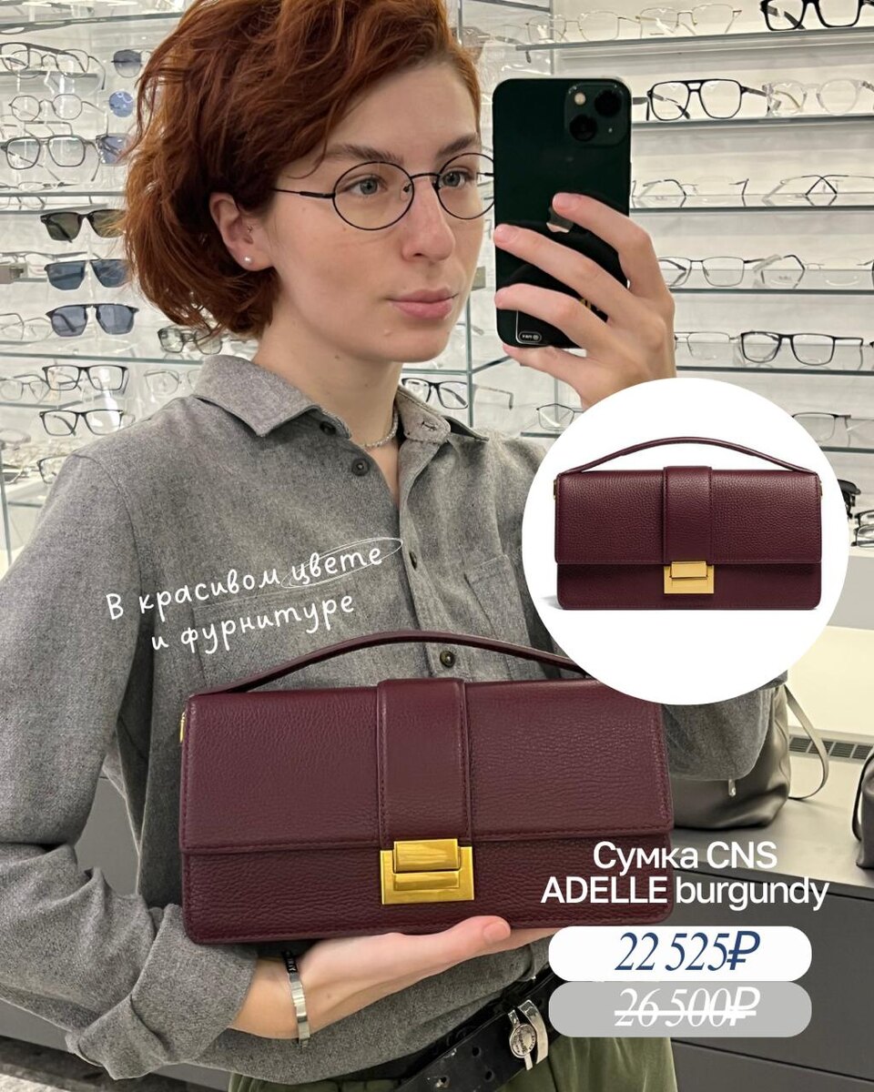 Малышка, которая точно влюбит вас в себя! 🤩 Любимая форма сумки ADELLE в красивых цветах: 🤩сумка CNS ADELLE burgundy 22.525₽ 26.500₽ 🤩сумка CNS ADELLE NEW coffee 23.927₽ 28.150₽ 🤩Ваша сумка уже ждёт офлайн в нашем салоне на ул. Б.Покровской, 15 или на нашем сайте. Помочь определиться с цветом или размером сумки может наш заботливый персональный консультант Все сумки | Все с/з очки