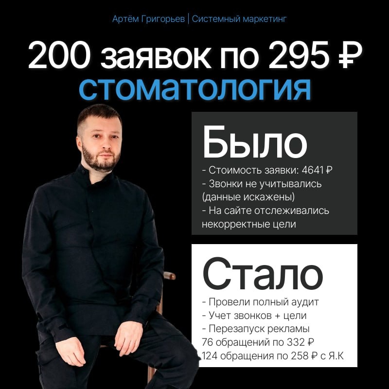 🦷 #Кейс. Стоматологическая клиника 200 обращений + Снизили стоимость обращения с 4641 ₽ → до 295 ₽ (средняя) Было: — Стоимость заявки: 4641 ₽ — Звонки не учитывались (данные искажены) — На сайте отслеживались некорректные цели Стало: — Провели полный аудит Директа и целей — Добавили учет звонков — Перезапустили кампании → Итого: 76 обращений по 332 ₽ Дополнительно усилили репутацию в Яндекс.Картах: → 121 звонок + 3 заявки (стоимость 258 ₽) 👉 Подробности на сайте: https://artem-grigorev.ru/kejsy/stomatologiya-snizhenie-stoimosti-zayavki