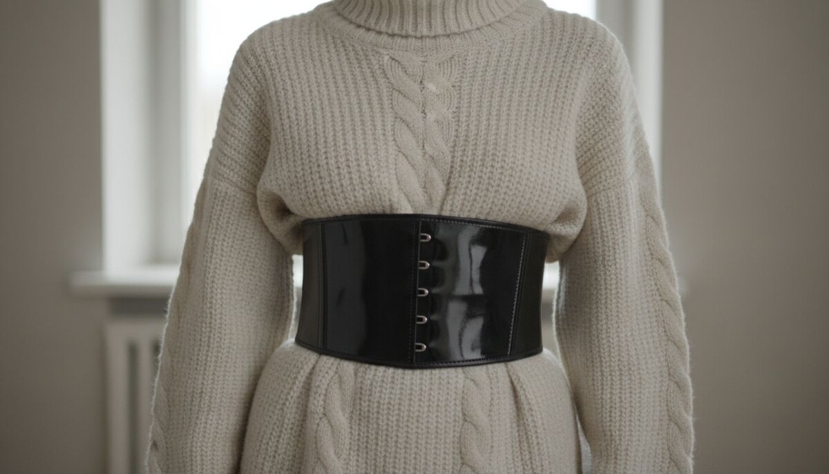 - Ремень: Выбирайте waist cincher из плотной замши или мягкой кожи, чтобы он мог немного «обнять» трикотаж, а не врезаться в него.