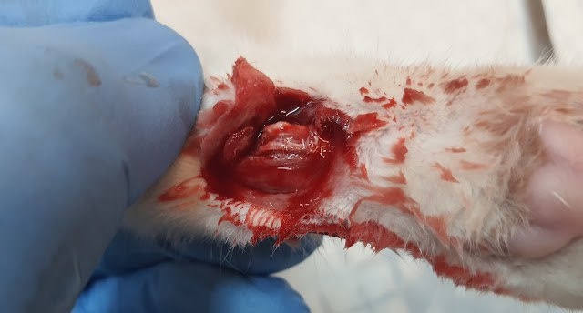 Для специалистов. Клиническая картина - разрез сухожилий сгибателей задней конечности у кошки. И клиническая картина места повреждения через 14 суток. Функционал полностью сохранен. Работаем!
