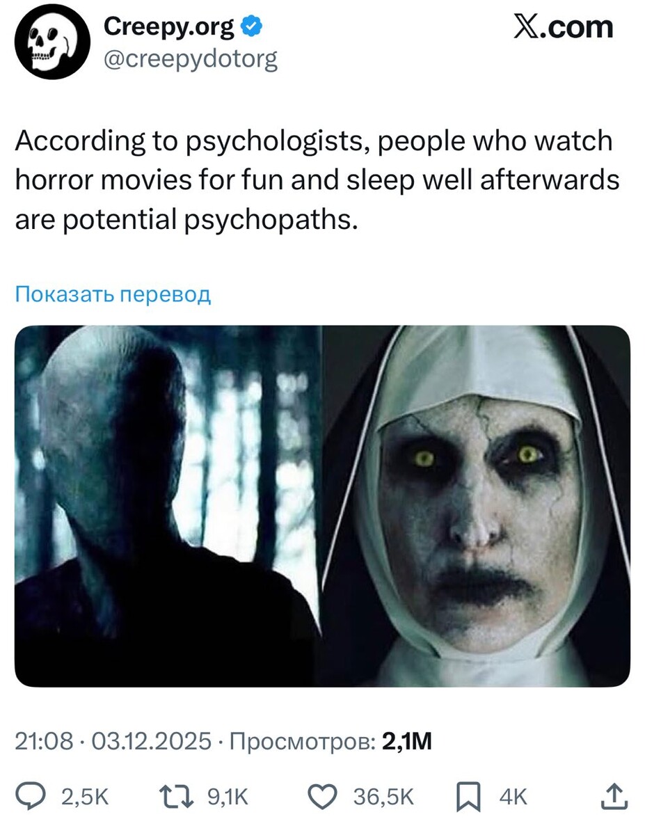 Люди, которые кайфуют от хорроров и при этом хорошо спят — потенциальные ПСИХОПАТЫ. Психологи утверждают, что у таких зрителей снижен уровень страха, слабая эмоциональная реакция, и отсутствует эмпатии. Психопаты не пугаются, а возбуждение от адреналина превращается в кайф. Они спокойно спят после, и им не снятся кошмары. Кто из вас? ❤️ Бесплатный GPT-bot ⚡️НейроМастер⚡️