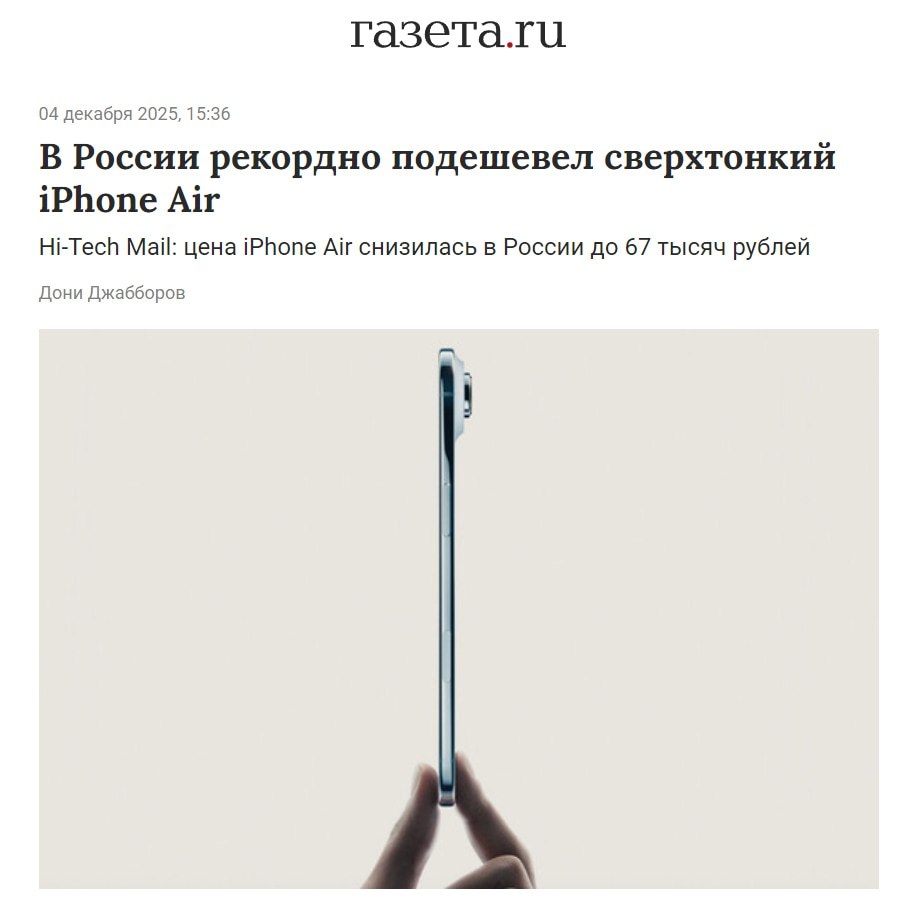 🔴 iPhone Air рекордно ПОШЕДЕВЕЛ — цену срезало почти в ДВА раза. Теперь за него просят 67 тысяч рублей, хотя в сентябре он стоил около 120 тысяч. Устройство формально считается провальным, но по факту это мощный смартфон с нормальной камерой и свежими фичами Apple. За такую цену это лучший вариант на рынке. Подарок на Новый год найден. CtrlAltDelights- подписаться