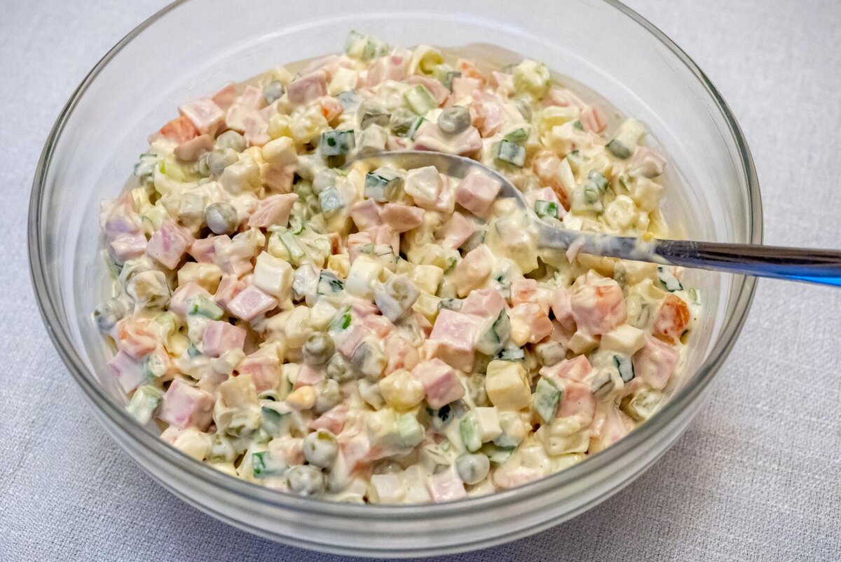 Минимальная цена базового набора продуктов для приготовления салата оливье в крупных магазинах выросла за текущий год на 2,1%. Об этом пишет ТАСС, ссылаясь на пресс-службу Ассоциации компаний омниканальной розничной торговли (АКОРТ). Так, минимальная стоимость продуктов для приготовления популярного салата к новогоднему столу на четырех человек в крупных торговых сетях выросла за год на 2,1%, до 363 рублей. В набор входят картофель, маринованные огурцы, яйца, вареная колбаса, консервированный горошек, лук, морковь и майонез. При подсчетах эксперты учитывали цены на самые доступные продукты питания. Аналитики отметили снижение цен на сезонные овощи, куриные яйца и майонез. Картофель за год подешевел на 31%, лук – на 22%, морковь – на 19%. Куриные яйца стали дешевле на 14%, майонез – на 13%. При этом подорожали консервированный горошек (+22%), маринованные огурцы (+14%) и вареная колбаса (+2%).