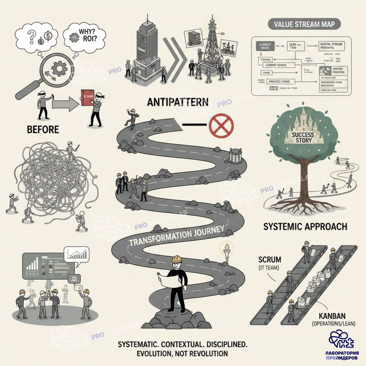 Прошли годы, но, к сожалению, и в 2025 году я наблюдаю: собственники, прочитав переведённую с ошибками красную книгу по Scrum или посетив показательные экскурсии, начинают тотально трансформировать свой бизнес. В результате – страдает операционная деятельность, люди, и там, где должна была быть выгода, получают одни потери.