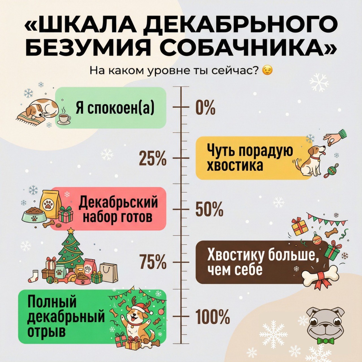 ⚡️ На каком уровне ты сейчас? Напиши в комментариях свою цифру и отметь друга, у которого стабильные 100% 😅 В декабре у собачников своя особенная шкала безумия Кто-то просто покупает корм как обычно. А кто-то уже планирует фотосессию с хвостиком, отдельный подарок и запас вкусняшек “на праздник” За праздничным настроением и вкусняшками для хвостиков — в Мистер Гав!
