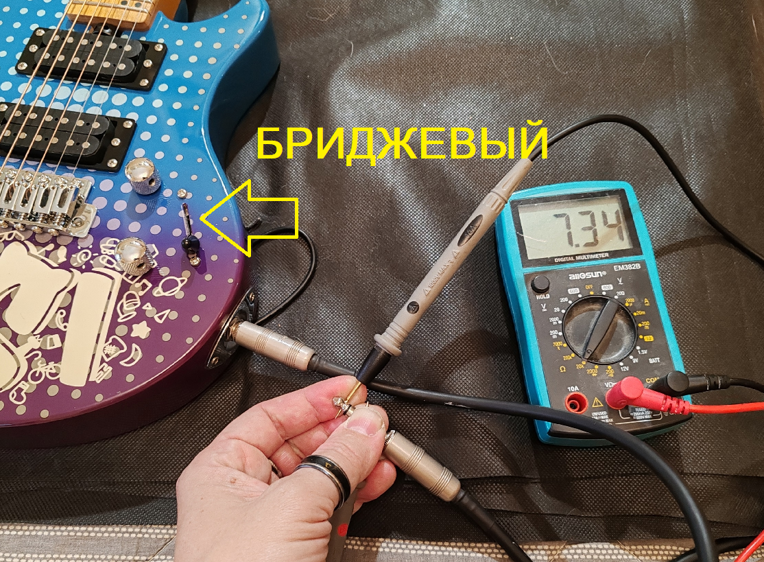 Как сделать блиц-проверку, не вскрывая гитару? Берём мультиметр. Втыкаем в гитару гитарный провод. И измеряем сопротивление на концах гитарного провода в разных положениях тумблера. В первом приближении мы таким методом замеряем сопротивление звукоснимателей. По сравнению с километрами проволоки на звукоснимателях, погрешность от проводов внутри гитары и от 3-5 метров гитарного кабеля считаем несущественной.