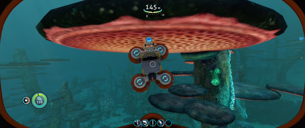 Учитывая факт провальной спасательной операции, у меня не осталось выбора, кроме как направиться назад, в сторону базы, и продолжить развертывание. Также я созрел до понимания, что мне нужна подводная лодка. Для этого мне понадобилось создать «переносной сборщик транспорта», который я в итоге кинул в открытое пространство, и он застрял под грибом. Я не знал, что он всплывает на поверхность. К счастью, его можно упаковать и кинуть в новое место.