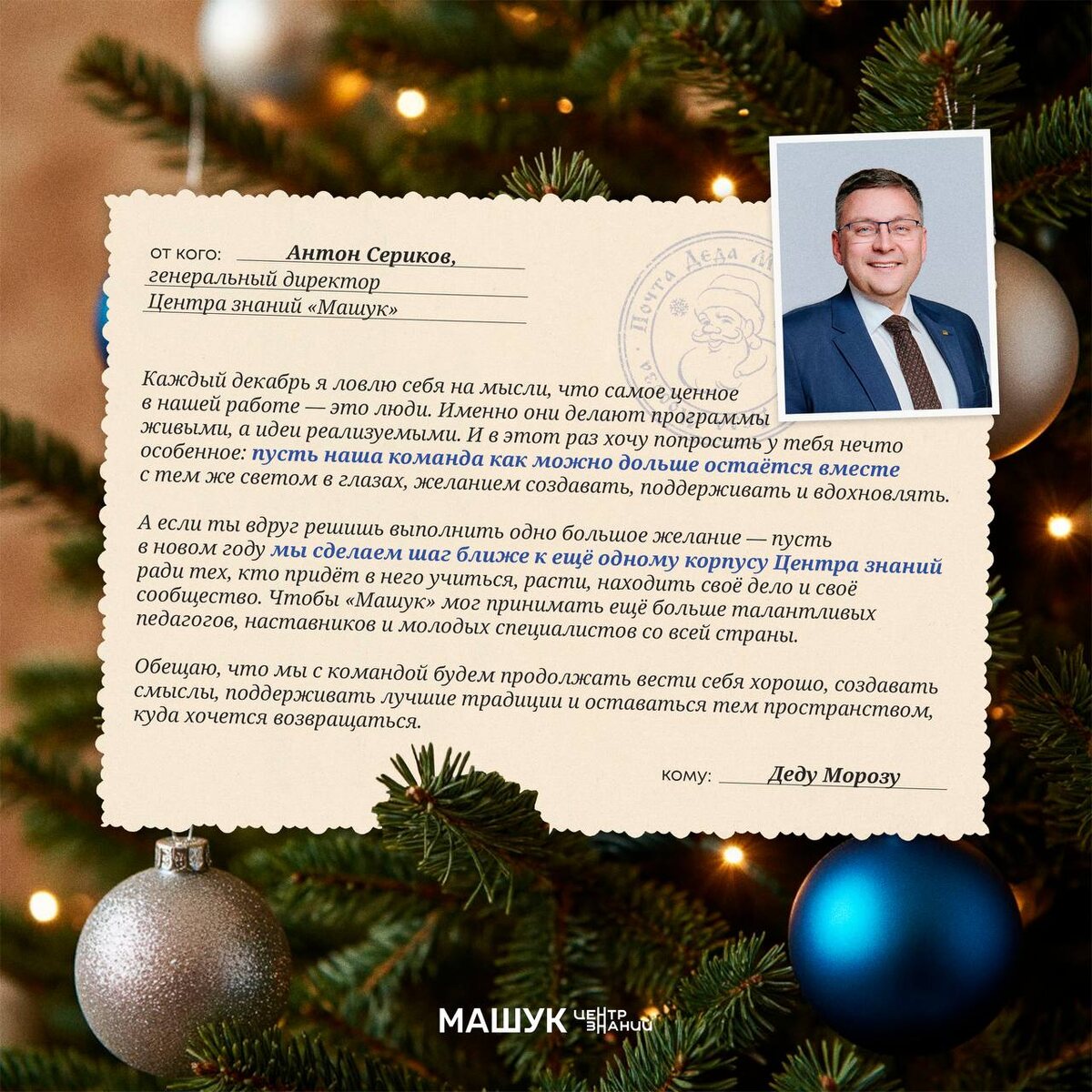 Сегодня магический вечер, когда можно загадать желание Дедушке Морозу 🎁 Часть команды Центра знаний «Машук» так и сделала: кто‑то пожелал улучшений для нашего Центра, кто‑то искренне захотел порадовать вас, кто‑то – себя, а кто‑то загадал предмет, с помощью которого можно и новый корпус отстроить, и бассейн с маникюрным салоном 🤭 Это мы к чему? 👉Сегодня, в День заказов подарков Деду Морозу, каждый может вернуться в детство, написать искренне письмо с пожеланиями на новый 2026 год, положить под ёлочку (если уже нарядили) и верить, что добрый Дедушка обязательно исполнит все желания! А для нашей команды смм главным подарком станут бусты, чтобы мы могли чаще радовать вас нашими предновогодними историями. 🎄