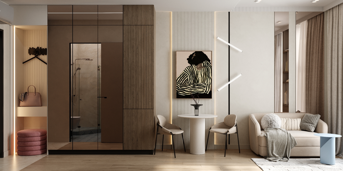 Мы в TI INTERIORS создали продуманный и стильный интерьер для молодой и энергичной девушки — небольшой студийной квартиры площадью всего 27 м², расположенной в бизнес-классе. Задача: максимум комфорта на минимуме Наша цель — сделать пространство универсальным и функциональным, но при этом светлым, женственным и лёгким. Даже на такой небольшой площади важно было грамотно разместить все зоны: гостиную, спальню, рабочее место и хранение — так, чтобы квартира ощущалась просторной и «вдохновляющей». Планировка и зонирование Мы разделили студию визуально, но сохранили её открытость. Использовали мебель и элементы, которые отлично зонируют, но не «ломают» пространство. Так, зона отдыха и спальная зона грамотно «сплетаются», обеспечивая ощущение единого целого. Цветовая гамма и материалы Основу интерьера составили натуральные и мягкие оттенки — спокойные нейтральные тона, которые работают на визуальное расширение пространства и успокаивают. При этом в деталях есть интересные а