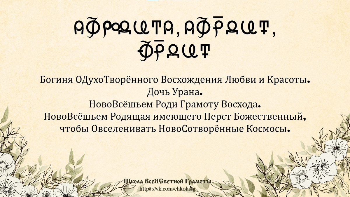Штобъ ВЭкну ТяЖЭту РаДЫИм ГотИти - i НоваКосма ДЛЯ! - БРаТи ТоЧку, ТьвОряШа ГЛуБОстЬ, ДОнЕле ОБрящемъ ШИРОсТь съ ДОлГоСтьЮ и чрез СПрАвны ВитиЯ ТълСтИнъ ШирЯ Ся ПЕнОсТЬЮ, АФ РоДи Та СПИРаМъ ЖивОтМiрОвъ". Лекция Герьвьеца.14.10.1999 28:05 Афродита. Пенность https://rutube.ru/video/6dc11651988362a447a559a68c2e2f34/?t=1687&r=plwd Лекция Герьвьеца.11.11.1998 1:08:30 Афродита выходит из Пены Морской. https://rutube.ru/video/faadc674df17f744d3d6f42cac37b32b/?t=4112&r=plwd Лекция Герьвьеца. 12.11.1997 24:40 Верьвие. Афродитика. Чаризм. Чары. Очаровательный. 64 Меры. https://rutube.ru/video/9e4921f7f2ff50aed2baf477621699f0/?t=1482&r=plwd Лекция Герьвьеца. Карлсруэ. Л.9 22:00 Меры. Пенность. Афродита. И Десятиричное. https://rutube.ru/video/cc01e9a79d9b8e01f64c55516f0bbf41/?t=1321&r=plwd Лекция Герьвьеца. 04.10.1996 26:20 Афродита. Баба-Яга. https://rutube.ru/video/e32846375ad60322a5dd4da05073b609/?t=1581