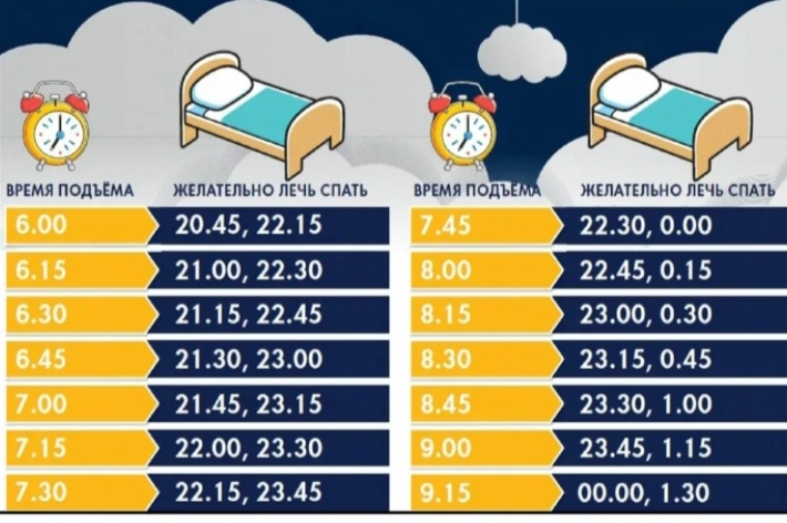 Всем привет , друзья! Сегодня я прочитал про интересную штуку - циклы сна, и хочу поделится с вами об этой информации. Думаю, что у всех постоянно происходит 1 ситуация: ты спишь до 5 часов утра, просыпаешься и бодр, но после того как сново засыпаешь и уже просыпаешься в 7 часов утра - ты не выспался и очень зол. Такая ситуация бывает, и очень часто. На это влияют циклы сна. Цикл сна - фаза сна. Она длится ~1:30 часа - 1:40 часа. Так вот. Почему же они нам так нужны? Потому что когда мы спим определённое количество циклов сна, то мы высыпается и всё хорошо (тоже самое что и вставать без будильника, т.к. просыпаешься в конец цикла сна). Но когда вы проспали чуть больше или меньше цикла сна - мы сонные. Наверху представлена картинка, когда надо ложится спать и просыпаться. Но, как сделать что бы мы ровно попали в цикл сна? Допусти мы встаём в 8 часов. Значит заводим будильник на 8 часов, но... Ещё мы заводим будильник на 6 часов 30 минут, что бы после того как мы сонными просыпаемся