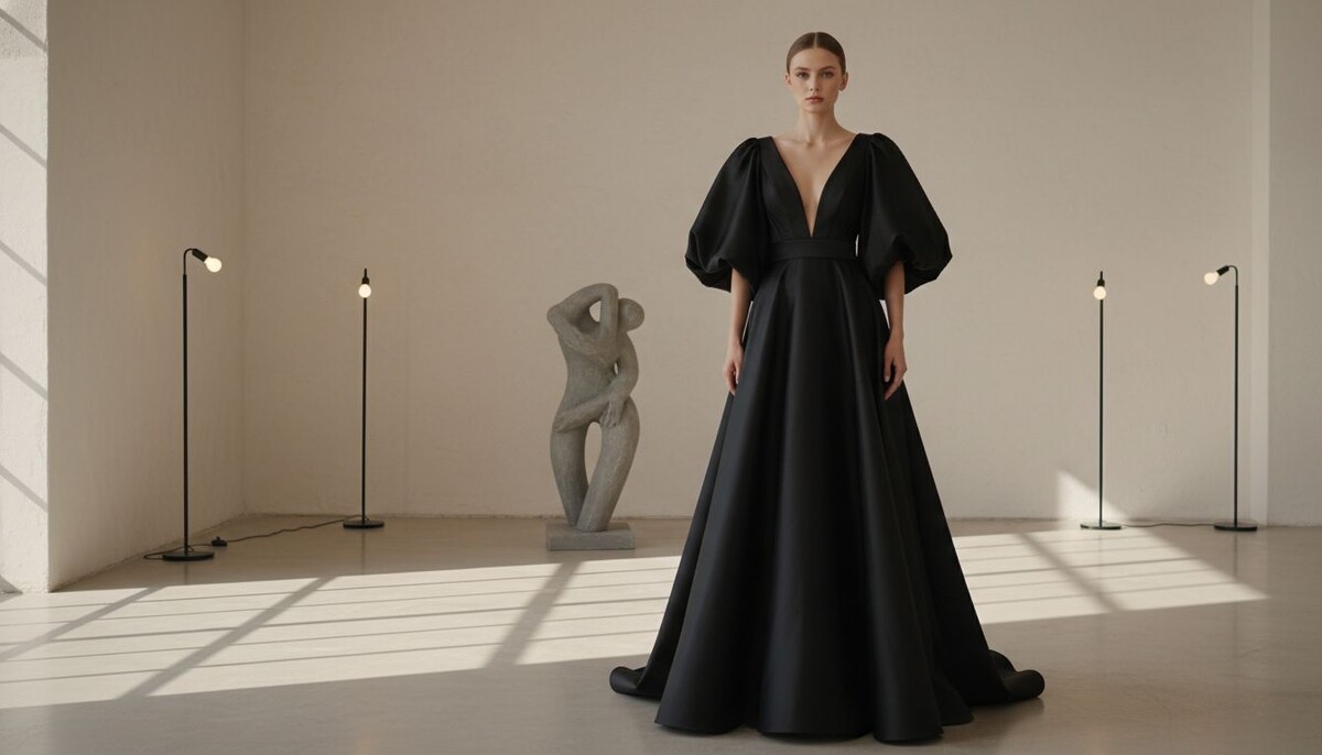 Современный рукав-баллон – это не мягкая драпировка. Он часто выполнен из плотных, держащих форму тканей – тафты, плотного шелка, или даже тяжелого узорчатого броката, что позволяет ему сохранять свою идеальную сферическую или овальную форму, независимо от движения. Это чистая, графичная скульптура.
