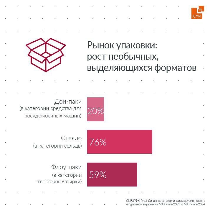 Виды упаковки набирающие популярность в 2025 году 📦 Ключевым драйвером FMCG-рынка сегодня является удобство покупок и потребления. Оно напрямую влияет на потребительский выбор и, как следствие, на упаковку. В 2025 году заметный рост в натуральном выражении показывают необычные форматы, выделяющие продукт на полке: 🔸 Дой-паки показывают впечатляющий рост +58,5% в категории средств для посудомоечных машин, в то время как сама категория снижается на -1,3%. 🔸Стеклянная упаковка демонстрирует +76,3% в сегменте сельди, несмотря на общий спад категории на -3,9%. 🔸Флоу-паки (+19,6% в творожных сырках) уверенно опережают рост категории (+7,8%). 🔸Картонные коробки (+33,6% в мармеладе/восточных сладостях) значительно превосходят средний показатель категории (16,0%). 📈 Тенденции рынков - подписаться
