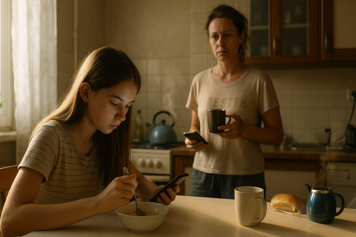 Марина бросила быстрый взгляд на часы и чуть поморщилась: опаздывают. Потом — на дочь. Лера сидела за столом, согнувшись над телефоном, как над потайной книгой. Одна рука держала ложку с хлопьями, другая привычно листала ленту. Хлопья уже размокли, ложка давно перестала подниматься ко рту.