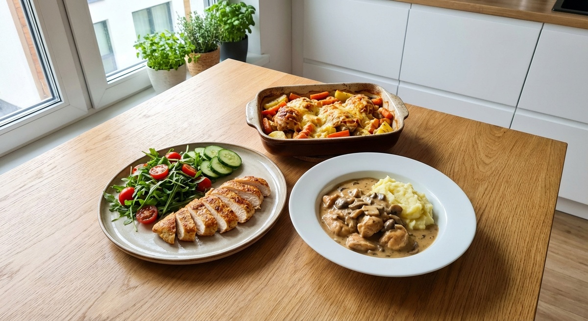 купили куриное филе «на ужин», а по факту получили сухой, пресный кусок, который хочется запить чем угодно. В этой статье — 3 варианта куриного филе, которые: реально сочные; выглядят «как в кафе»; готовятся на обычной домашней кухне. Меню: Сочное филе в йогуртовом маринаде на сковороде Куриное филе в духовке с овощами и сырной корочкой (один противень) Курица в сливочно-грибном соусе «как в ресторане» Все количества — на 2 порции. 1. Сочное филе в йогуртовом маринаде на сковороде Быстрый вариант на каждый день: