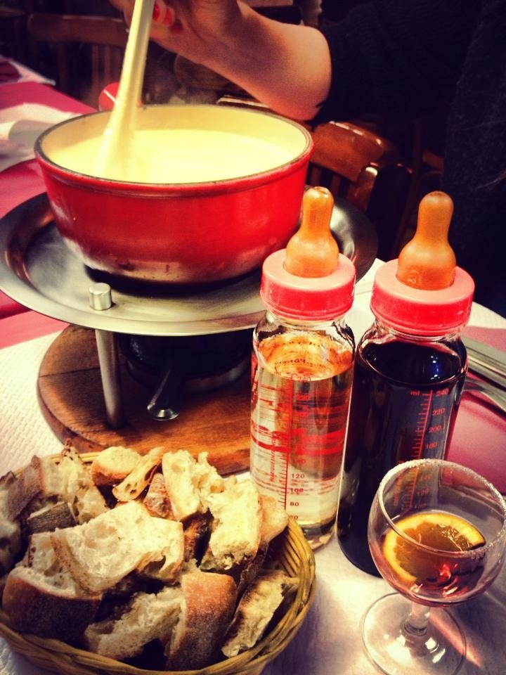 Это — ресторан Le Refuge des Fondus. В основном сюда приходят за фондю и смешными фотографиями с вином. Ужины тут по расписанию: первая посадка в 19:15, вторая — в 21:30. Приходить нужно ко времени, и лучше бронировать столик заранее, потому что желающих всегда много. В меню есть только две опции, и обе «комбо»: то есть в заказ сразу включена небольшая тарелка закусок, аперитив, детская бутылочка вина, горячее и десерт на выбор. В первом варианте принесут большую кастрюлю фондю и корзину багета к нему, но если сыр совсем не хочется — можно попросить говядину с картошкой на горячее. Цена за заказ фиксированная — 31 евро (примерно 3000 рублей) на человека. Ещё в этом заведении необычная посадка. Во-первых, она очень плотная: то есть все столы буквально придвинуты друг к другу так, что сливаются в один большой. Так что завести беседу с гостями за соседним столиком будет ну очень уж просто. Во-вторых, садиться за стол тоже нужно по-особенному. Так как столы стоят вплотную, чтобы сесть за