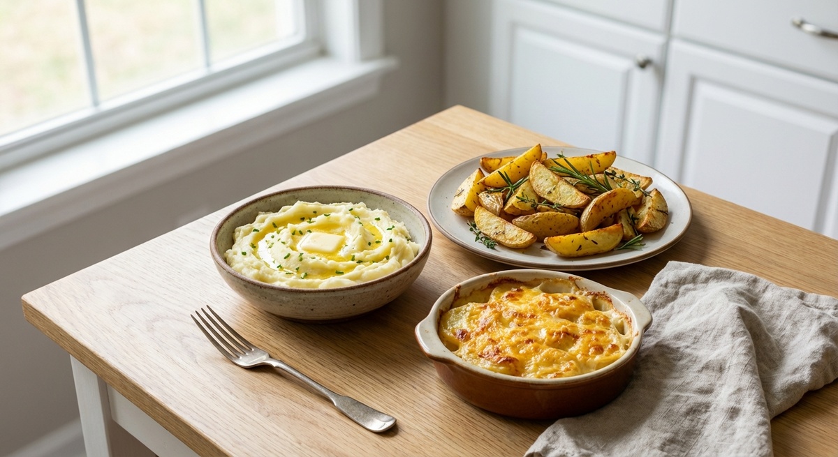 А в кафе она внезапно превращается в: нежное пюре «как облачко»; идеальные дольки с хрустящей корочкой; кремовый запечённый картофель под золотистой корочкой. В этой статье — 3 варианта картофеля, которые: реально можно сделать дома; красиво смотрятся на тарелке рядом с мясом/рыбой; подойдут и на обычный ужин, и «на гостей». 1. Нежное картофельное пюре «как в ресторане», а не комками Секрет не только в масле и сливках, но и в технике: какой сорт, как варить, как разминать. Ингредиенты (на 3–4 порции) Картофель (лучше рассыпчатый) — 700–800 г Молоко — 150–200 мл Сливочное масло — 40–50 г Соль — по вкусу По желанию — сливки 10–20% (50 мл вместо части молока) Как приготовить Режем одинаково.