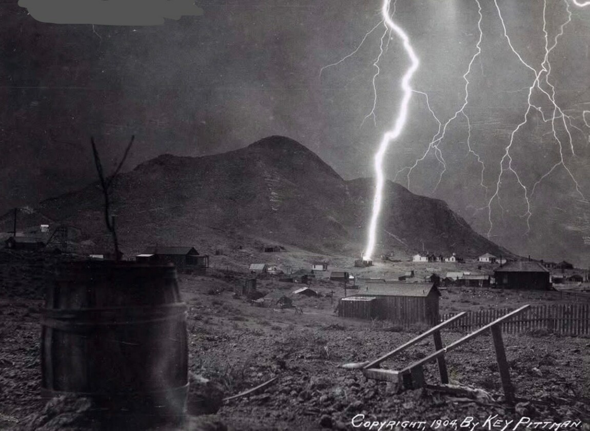 Редкая фотография 1904 года фиксирует драматичный эпизод: молния поражает шахтёрский посёлок Тонопа в штате Невада. Согласно рассказам очевидцев, удар пришёлся на один из домов — в результате металлическая печка‑буржуйка внутри расплавилась, но люди не получили никаких травм.