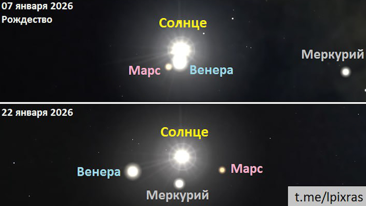 К 7 января на небе может возникнуть уникальный парад планет. Ученые предупреждают, что его не получится рассмотреть без телескопа или бинокля, но и ими нужно пользоваться с осторожностью – лучше обратиться к профессионалам. Фото: Лаборатория солнечной астрономии ИКИ и ИСЗФ Парад планет начал формироваться на небосводе впервые с осени 2019 года. Следующее такое схождение произойдет только в сентябре 2038 года. По данным лаборатории солнечной астрономии ИКИ и ИСЗФ, в канун Рождества – в ночь с 6 на 7 января – Солнце, Венера и Марс почти сольются в одну точку, образуя на небе своеобразную Вифлеемскую звезду. 22 января ближе станет Меркурий, составив с другими планетами ромбовидную конфигурацию. Как сообщил ТАСС научный сотрудник ГМИК им. К. Э. Циолковского Александр Алексеев, парад не получится увидеть невооруженным глазом. Планеты будут теряться в лучах Солнца. Кроме того, есть опасность повредить сетчатку глаза, если неправильно наводить телескоп или бинокль. Смотрим «Вести. Волгоград»: