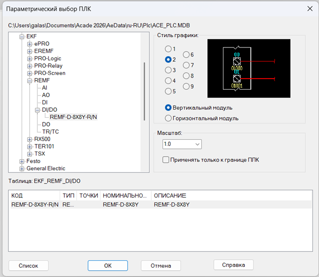 Количество цифровых входов - 8 Количество цифровых выходов - 8 В базе данных параметрических ПЛК модули состоят из двадцати четырех точек ввода/вывода. При размещении для модуля можно выбрать стиль графики, вертикальную или горизонтальную ориентацию. При размещении предусмотрен разрыв модуля после 11, 20 и 23 клемм. Размещенному модулю назначается поз. обозначение и другие характеристики. В Базу данных каталога добавлены каталожные данные для двух исполнений: · Модуль дискретного в/в REMF 8/8 PRO-Logic EKF · Модуль дискретного в/в REMF 8/8 N PRO-Logic EKF Оба исполнения размещены на схеме: Отчет «Спецификация»: По схеме получен отчет «Таблица соединений»: Отчет «Таблица соединений» размещен на чертеже. Модули на чертеже компоновки. Я 🩷AutoCAD Electrical !