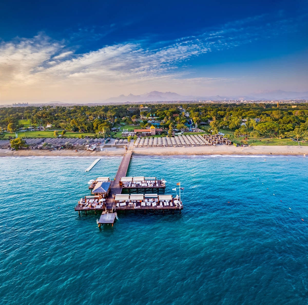 Отель стоит в 38 км от аэропорта Антальи в районе Аджису. Территория – 68 000 кв. м. Интересный факт – при его строительстве в 2001 году не срубили ни одно дерево. Сегодня это сплошная зелень, где корпуса прячутся в садах, а пляж длиной 75 метров – не растянутая полоса с шезлонгами в три ряда, а компактная приватная зона с павильонами. Рядом находится поле для гольфа Gloria Golf Club с 45 лунками. До него – пара минут на багги или бесплатном шаттле.