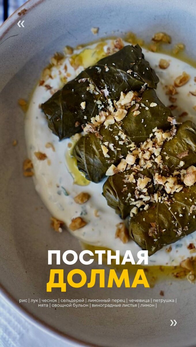 Долма постная вегетарианская 🤍🌱 Я первый раз попробовала вегетарианскую долму на Крите, до сих пор помню этот вкус, а еще с охлажденным домашним греческим вином 🫶🏻 было так вкусно и особенно мне запомнилось, что там чувствовался лимон и мята👌🏻 я немного дополнила этот рецепт чечевицей 👌🏻 Лук 1 шт Чеснок 3 зубчика Сельдерей 1 стебель Рис 150 Чечевица зеленая 100 гр (в сухом виде), можно заменить на консервированную 👌🏻 Соль/перец по вкусу Лимонный перец 1/3 ч.л Петрушка 1 пучок Мята 3-4 веточки Цедра 1 лимона Сок 1/2 лимона Вода/овощной бульон 250 мл для начинки Вода/овощной бульон для тушения 300 мл Листья винограда 1 банка Грецкие орехи для подачи (горсть) 🧄Лук и чеснок мелко нарезать и обжарить на разогретой сковороде на среднем огне в течение 5-7 минут практически до готовности, туда же добавляем лимонный перец и обжариваем ещё минуту, чтобы от температуры аромат раскрылся. Затем туда же добавляем мелко нарезанный сельдерей и жарим ещё минут 5-7. Овощи будут практически