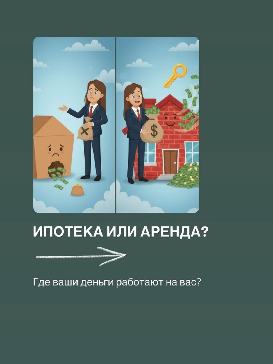 Давайте честно: универсального ответа нет ‼️ Иногда аренда — это правильный выбор. Если вы не уверены, в каком городе хотите жить, или вам нужно жилье на короткий срок (до 1-2 лет) — аренда дает гибкость. Во всех остальных случаях стоит считать 💵 Философия ипотеки: Покупка актива в рассрочку Это принципиально другая модель. Вы тоже платите ежемесячно, но... Куда уходят деньги? Ваш платеж делится на две части: проценты банку и погашение основного долга. С каждым месяцем часть, которая идет в вашу копилку, растет. Что вы получаете? Свой собственный, ликвидный актив — квартиру. Итог: Каждый платеж — это инвестиция в ваше будущее. Хватит гадать, что выгоднее! Пора узнать ваши реальные возможности. Запишитесь на бесплатную консультацию, и мы: ☑️ Рассчитаем ваш возможный платеж по ипотеке. ☑️ Сравним его с вашей текущей арендной платой. ☑️ Покажем, какие квартиры вы можете себе позволить уже сейчас. Перестаньте платить за чужие мечты. Пора инвестировать в свою!