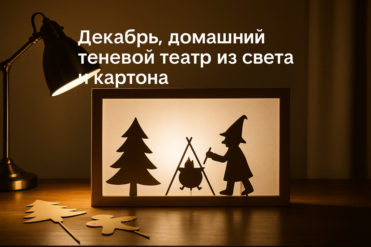 Теневой театр хорош тем, что опирается на естественные особенности декабря. Темнота за окном здесь не мешает, а помогает: комната становится залом, настольная лампа - прожектором, тонкая бумага - экраном. Даже небольшой стол превращается в сцену, где всё происходит на расстоянии вытянутой руки, без спешки и лишнего шума.