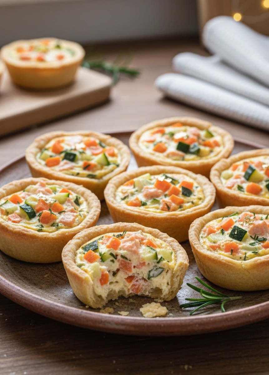 — Одним штолленом сыт не будешь, — сказали вы в комментариях. К тому же вторым в рейтинге блюд нашего новогоднего меню, согласно опросу, стал тарт с лососем и овощами. А мы, конечно же, с вами согласны. Тарт — значит тарт. Но признаемся, мы такое ещё ни разу не готовили. Поэтому решили потренироваться, тем более, что #рыбныйдень Мини-тарты с лососем и овощами Это та закуска, ради которой гости забудут про оливье. Хрупкие корзинки, нежная начинка из лосося и ярких овощей — маленькие, аккуратные и очень праздничные. Их удобно приготовить заранее: подаются они холодными и держат форму идеально. Ингредиенты (12–18 мини-тартов) Основа Мука — 200 г Сливочное масло холодное — 100 г Яйцо — 1 шт. Соль — щепотка Ледяная вода — 1 ч. л. при необходимости Начинка Лосось слабосолёный или слегка подкопчённый — 150–200 г Кабачок — ½ или один маленький Морковь — 1 шт. Лук-шалот или обычный — 1 шт. Сладкий перец — ½ шт. Укроп — 1–2 ст. л. Оливковое масло — 1 ст. л. Соль, перец — по вкусу Зал