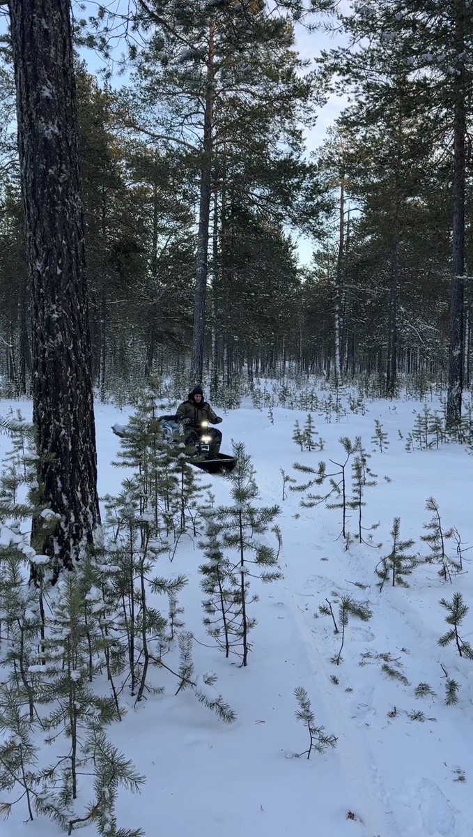 Ну что, вот и состоялись первые покатушки на моей мотособаке. Перед тем как выезжать на настоящую рыбалку, я решил всё-таки обкатать технику в черте города вместе с друзьями — мало ли что. Вдруг трос дросселя где-то недотянул, или под нагрузкой собака поведёт себя не так, как я ожидал. День выдался прямо сказочный. Морозный, солнечный — тот самый зимний свет, когда тени от сосен и елей становятся синеватыми, а на ветках висит пушистый иней, будто кто-то аккуратно посыпал их сахарной пудрой. Снег под ногами потрескивает, дыхание превращается в плотный белый пар — красота. Скатил собаку с прицепа, зацепил сани. — Давай, я первый! — уже кричит Серёга, плюхается в них, словно в кресло-шезлонг. Ну что, поехали. Сразу ушли в пухляк: местами по колено, в среднем сантиметров тридцать. Мотособака даже не задумалась — просто взяла и пошла, уверенно, ровно, будто всю жизнь по таким сугробам бегала. Через пару минут выехали на чей-то путик — и здесь она вообще ожила. Серёга достаёт телефон: —