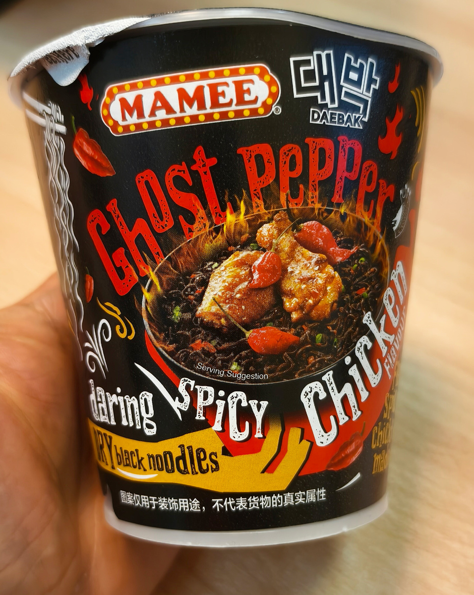 Всем привет! Прикупил эту лапшу на маркетплейсе с хорошей скидкой. По итогу получилось 125 рублей за стакан. Один минус, что ехала лапша 45 дней. Если хочется быстрее, то придется отдать не меньше 600 рублей. А так если будет слишком остро, то не жалко будет выкинуть). Куриная лапша с призрачным перцем. Русского перевода нет. В общем проводится челлендж по преданию этой лапши. На свой страх и риск). 1 млн.сковиллей. Достаточно много для обычного человека. В комплекте черная лапша. От нее идёт аромат чего-то копченого. Сухих специй нету, видимо приправа в самой лапше. Пакетик с соусом и вилка. Больше ничего нету. Я не совсем разобрался как ее правильно приготовить. Вроде как нужно было заварить, слить воду, а потом размешать с соусом. Я же добавил черный соус и залил кипятком. Думаю это не совсем правильно, но мне без разницы). Хотя в способе приготовления указано что всё-таки что-то нужно добавить перед заваркой. В общем получилось такая лапша. От нее шел аромат копчени