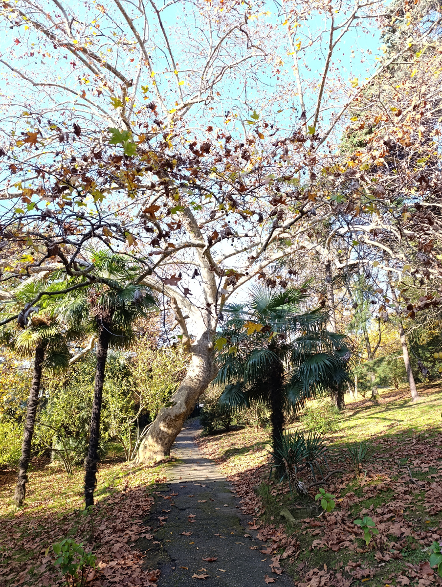 Слышали про такую? И я нет, пока не прочитала историю про создание Дендрария, который и возник на склонах Лысой горы. А Лысой она стала после вырубки на ней деревьев под дачи. Так вот, я решила пешком дойти до самой высокой точки Дендрария, где установлена верхняя вышка канатной дороги. Обычно посетители Дендрария туда поднимаются в вагончике, а оттуда спускаются пешком вниз. У самой вышки в общем -то делать нечего, если только перекусить в кафе или полюбоваться городом с высоты. Теперь по порядку. Зайдя в Верхний парк, сразу свернула влево, чтобы посмотреть, какие растения встречаются в этой части парка И сразу привлек внимание старый платан А с другой стороны очень высокое дерево хурмы с ярко-оранжевыми плодами. Опята Далее путь лежал мимо Японского садика который прогуливающихся всегда привлекает своей яркостью А это воздушные корни кипарисов Далее вверх по лестнице Вид сверху к архитектурному ансамблю "Утро" Всё выше и выше И вот уже над головой пролетают вагон