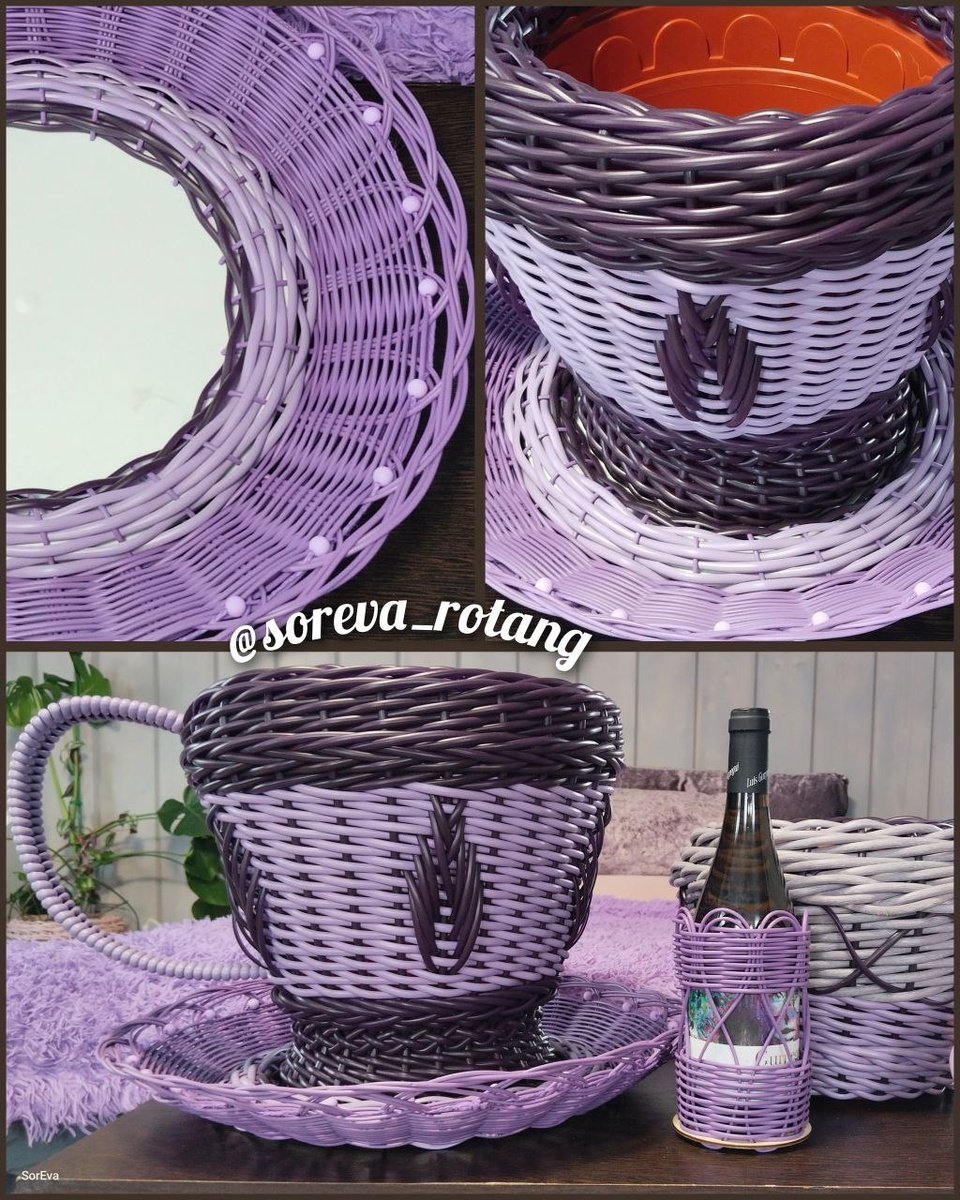 Получился очень нежный фиолетово-сиреневый набор, созданный между гирляндой и шарами. Это моя первая проба нового способа плетения блюдца, и, кажется, результат получился ажурным и легким. Кашпо украсила в стиле тюльпанов. Хозяйка осталась довольна! А вам как?