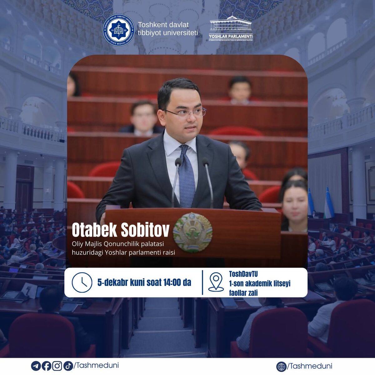💬“O‘zbekiston Respublikasi Konsitutsiyasi-erkin va farovon hayot garovi” mavzusida ochiq muloqot bo’lib o’tadi ➡️8-dekabr – O‘zbekiston Respublikasi Konstitutsiyasi qabul qilinganligi munosabati bilan, 2025-yil 5-dekabr kuni Toshkent davlat tibbiyot universitetida 🏢Oliy Majlis Qonunchilik palatasi huzuridagi Yoshlar parlamenti raisi Otabek Sobitov ishtirokida talabalar uchun ochiq muloqot tashkil etiladi. 🔹Tadbirda Universitetimizning Yoshlar parlamenti a’zolari, davlat mukofotlari sohiblari hamda iqtidorli faol talabalar ishtirok etishadi. 🔹Tadbir doirasida Konstitutsiyaning jamiyat hayotidagi ahamiyati, yoshlarning huquqiy faolligini oshirish, fuqarolik pozitsiyasini mustahkamlash hamda konstitutsiyaviy islohotlarda yoshlarga yaratilayotgan imkoniyatlar haqida fikr almashiladi. 📍Manzil: ToshDavTU 1-son akademik litseyi, faollar zali 🕐Vaqt: 14:00 🔹Mazkur uchrashuv yoshlarning siyosiy jarayonlardagi ishtirokini kengaytirish, huquqiy ongini yuksaltirish va Konstitutsiya tamo