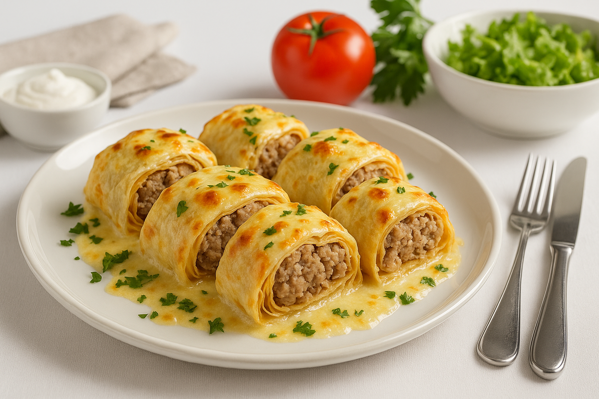 Ароматная, нежная запеканка в форме, сверху золотистая корочка. Рулеты из лаваша лежат плотно, слой за слоем, начинка сочная, тянется легкими нитями. Иногда хочется приготовить что то простое, но эффектное. Чтобы поставила форму на стол и сразу почувствовала, как в комнате поднимается настроение. Эта запеканка как раз такая. Нежные рулетики из тонкого лаваша с мясной начинкой, собранные в один слой и щедро залитые яично сметанной заливкой. Получается очень домашне, с ароматом теплой кухни и обещанием второго кусочка. Рецепт Ингредиенты на форму 20х20: Лаваш тонкий 2 листа Фарш мясной 400 г Лук 1 штука Сметана 200 г Яйца 3 штуки Паприка, чеснок, соль, перец Немного твердого сыра Масло для смазывания формы Приготовление Лук мелко поруби, смешай с фаршем и специями. Обжари до полуготовности чтобы начинка держала форму. Лаваш разрежь на полосы шириной 6 см. На каждую выложи ложку фарша и сверни плотный рулет. Форму смажь маслом и выложи рулеты в один слой. Смешай яйца со сметаной