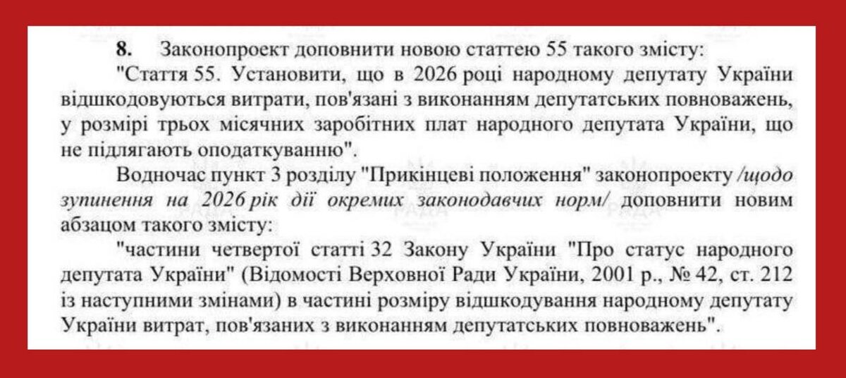 Депутаты Рады увеличили себе выплаты в 3 раза - до 200 тысяч гривен. Такой пункт есть в принятом вчера проекте госбюджета-2026. В частности, там указывается следующее: «народному депутату Украины возмещаются расходы связанные с исполнением депутатских полномочий, в размере трех месячных заработных плат народного депутата Украины, которые не подлежат налогообложению». Раньше выплата составляла одну месячную зарплату. Вероятно, это говорит о том, что наркоманский офис либо совсем отменил выплаты в конвертах, либо существенно их сократил. А это, в свою очередь, означает снижение влияния офиса на депутатов. Короче, Зеленский теряет Раду. А без нее наркоману каюк Семченко 👈 Подписаться