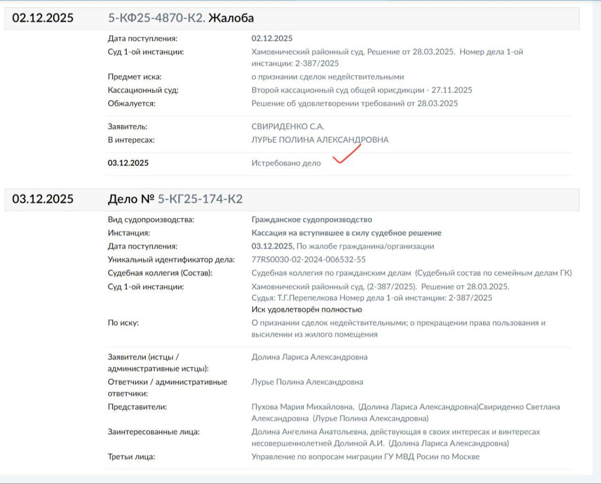 ⚡️Верховный Суд истребовал дело по жалобе Полины Лурье против Ларисы Долиной