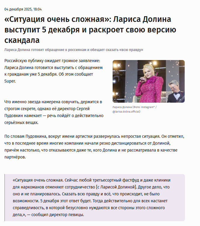 В чем главная проблема Ларисы Долиной. Как мне кажется, она в том, что Лариса Александровна так и не поняла, что наша страна изменилась. Люди в нынешней России уже давно не те, что были в 2000-х. И даже не те, что были в 2010-х. И даже не те, что были в 2021-ом... И телефонное право в этой новой стране уже не всегда работает. И если ей даже кто-то что-то пообещал (даже очень в высоких чинах), то это не значит, что именно так все и будет. Потому что в России есть гражданское общество, с которым в таких случаях, как «дело Долиной» все вынуждены считаться. Кстати, не только она должна сделать этот вывод!!! А возвращаясь к Долиной и, как я понимаю читая скрин опоздавшей попытке покаяться, то ей это уже не поможет. Но может поможет другим — предостережет в будущем от таких же «поступков». Да мы же всё понимаем. Мы понимаем, что это не совесть у Ларисы Александровны проснулась, а … страх. Страх от понимания того, что она, пожадничав и вытерев (с кем-то на пару) ноги о ЗАКОН теряет НЕИМОВЕР