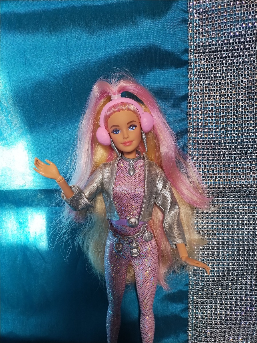 Всем доброго дня! Хочу представить вам фотосессиию в студии с изумительно красивой модной и харизматичной куклой. Барби Экстра Флай Зимнее Путешествие. Которую я купила случайно, без упаковки, но в идеальном состоянии, единственно, что голубая шубка и сапожки были утеряны. Которые я заменила на серебристую курточку и белые ботиночки. Все остальное, включая Серебристый комбинезон, аксессуары на поясе и шее, розовые меховые наушники у куклы были в наличии. В итоге образ, по-моему, получился ничуть не хуже оригинала. Кукла очень фотогенична , прирожденная модель. Работать с ней было сплошным удовольствием. Вобще эта кукла довольно редкая и дорогая, можно сказать, что мне опять фантастически повезло, что ко мне поселилась - прилетела! такая красотка. Это пострясающе симпатичная Милли с пышной копной розово- блондинистых волос, у нее чудесная стройная фигурка, которую удачно подчеркивает комбинезон. Встречаем Барби Экстра Флай Фотоэтюды со стулом Другой ракурс и освеще