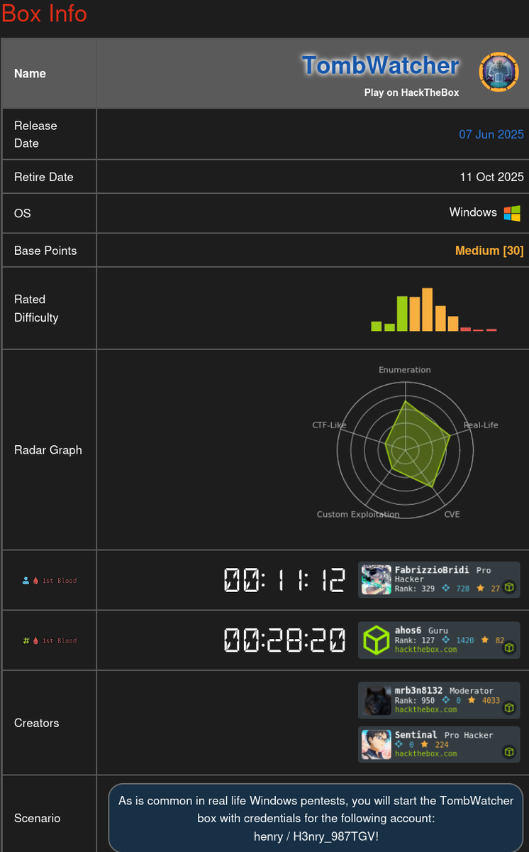 «Подобно реальной практике тестирования на проникновение в среде Windows, начните работу с TombWatcher, со следующими учетными данными: henry/H3nry_987TGV!»