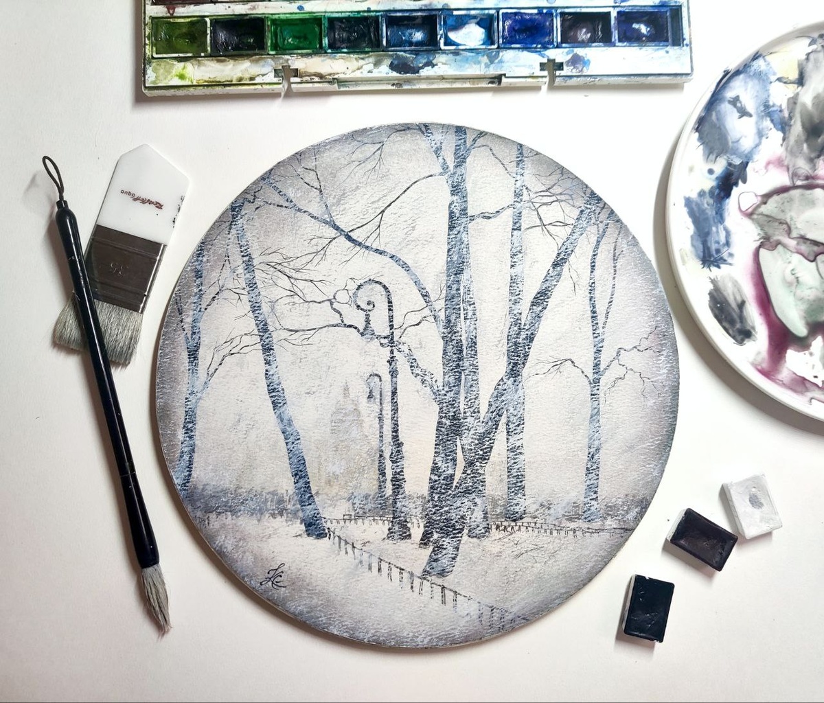 Последние дни пишу зимние работы с сугробами или снегопадом. Очень не хватает снега! Мне хотелось построить интересную композицию и, заодно, поработать с новыми соединениями красок для создания интересных жемчужных серых. В этот раз построила фон на соединении зелёной шпинели и фиолетово-розового хинакридона с капелькой светлой охры. Для хлопьев снега использовала кроющие титановые белила сначала в смеси с индиго и марсом коричневым и вторым слоем уже соло. 2025 "Мокрый снег в Румянцевском саду" Бумага Paul Rubens, 300 г/м², акварель, белила, 25 × 25 см.