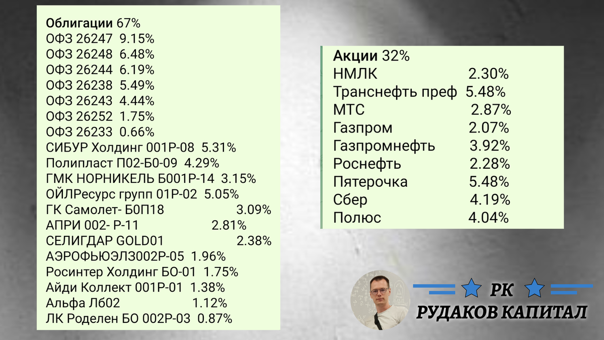 ЭКСПРЕСС РАЗБОР ПОРТФЕЛЯ (ПОСТ №1) Как и обещал, выпускаю один из бесплатных экспресс разборов, портфель на скрине, приятного чтения! 🎯 Цель инвестиций: Сохранить+ разумный рост. Ежемесячные поступления в виде купонов и дивидендов. Докупаю, чтобы суммы были примерно равные по месяцам. Счёт ИИС и полный реинвест. - владелец портфеля Портфель в целом хороший и можно его оценить на 7 из 10 баллов, но здесь некоторые моменты, которые стоит улучшить и есть так же потенциальные риски. Начнём с того, что при полном реинвесте денежного потока (дивидендов и купонов) вы находитесь на этапе формирования капитала, а значит стараться "чтобы суммы были примерно равные по месяцам" не нужно. Возможно, что так Вам психологически комфортно, но это не несёт практической пользы портфелю и усложняет структуру портфеля, что в соответствии ухудшает его управление. В процентном соотношении 32% акции и 67% облигации - отлично подходит под умеренный риск, что помогает формировать капитал и не