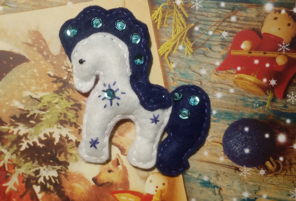 Всем здравствуйте! Эту новогоднюю лошадку я увидела в интернете (автора, к сожалению, не знаю); она мне понравилась, и сразу захотелось сшить такую милую ёлочную игрушку из фетра. Для начала нарисовала на бумаге выкройку лошадки. Вырезала все детали в двух экземплярах (в зеркальном отражении). Обвела детали на мягком фетре подходящих цветов (для этого использую гелевые ручки) и вырезала их. Силуэты лошади белые, а грива, хвост и седло - тёмно-синие. На смартфоне видно, как выглядит новогодняя игрушка-лошадка в оригинале. Для украшения использовала бисер и пайетки красивого голубого цвета. На гриве с каждой стороны закрепила с помощью бисера по пять пайеток. Они красиво переливаются и смотрятся нарядно. На хвосте с каждой стороны - по три пайетки с бисером. На обеих деталях лошадки вышила фиолетовой нитью-мулине по три снежинки. Пришила глазки - маленькие чёрные бусинки. Закрепила по четыре голубых бисеринки на седле и пришила седло к лошадке (делается это до соединения детале