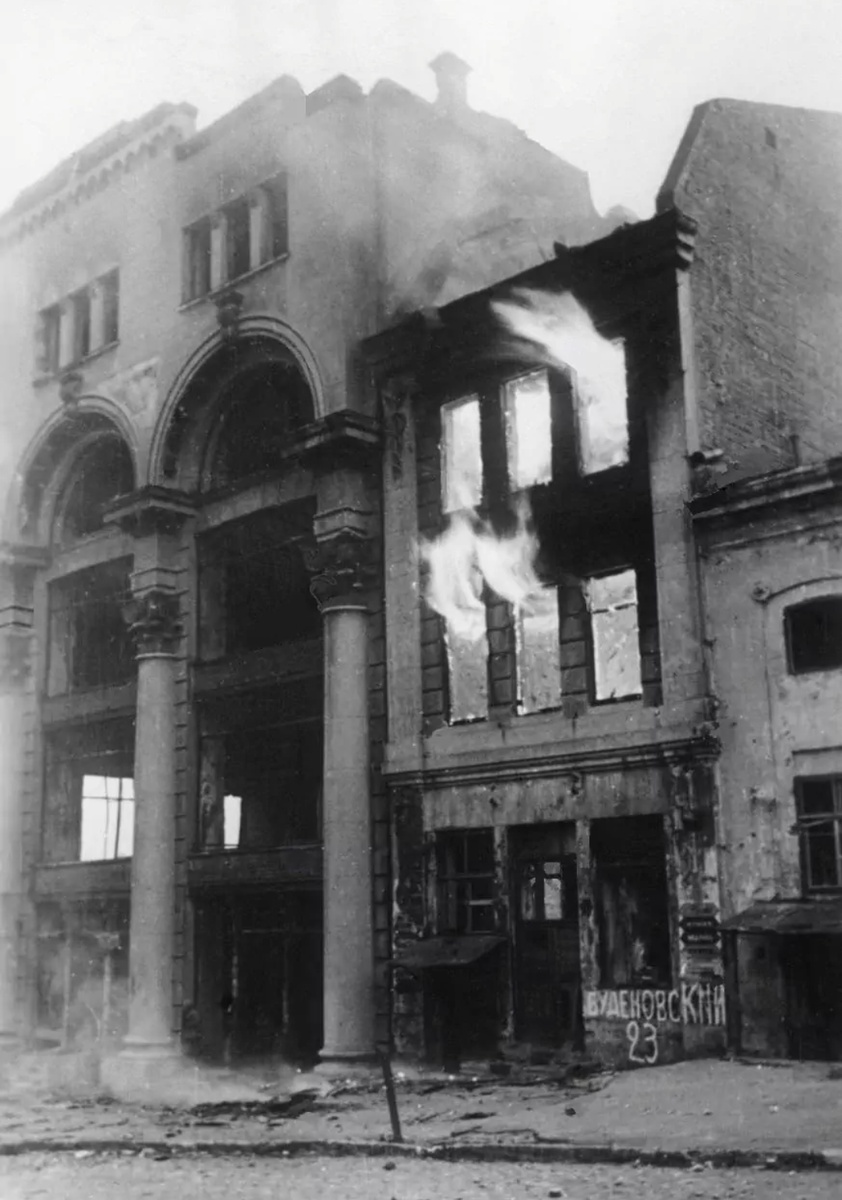 Фотография , примерно сентябрь 1942 года, во время фашистской оккупации города Ростова-на-Дону. Разрушенное здание клуба кожевенников, Будённовский проспект дом 74.
