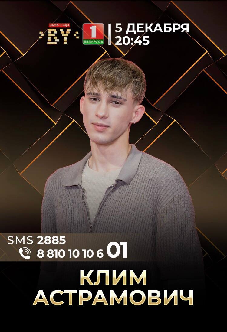 ⚡️Поддержим нашего студента Клима Астрамовича в первом прямом эфире шоу "Фактор.BY" завтра 5 декабря в 20:45 на Беларусь 1 Кто пройдет дальше — решаете ВЫ🔥 Голосуйте за Клима в прямом эфире! Сделать это можно: 🟠по телефону 8 810 10 10 6 01; 🟠по смс 2885 (в сообщении указать "01"). ❗️Голосование продлится 15 минут после выступлений всех участников! 💰 Стоимость звонка и смс — 50 коп. #анонсы