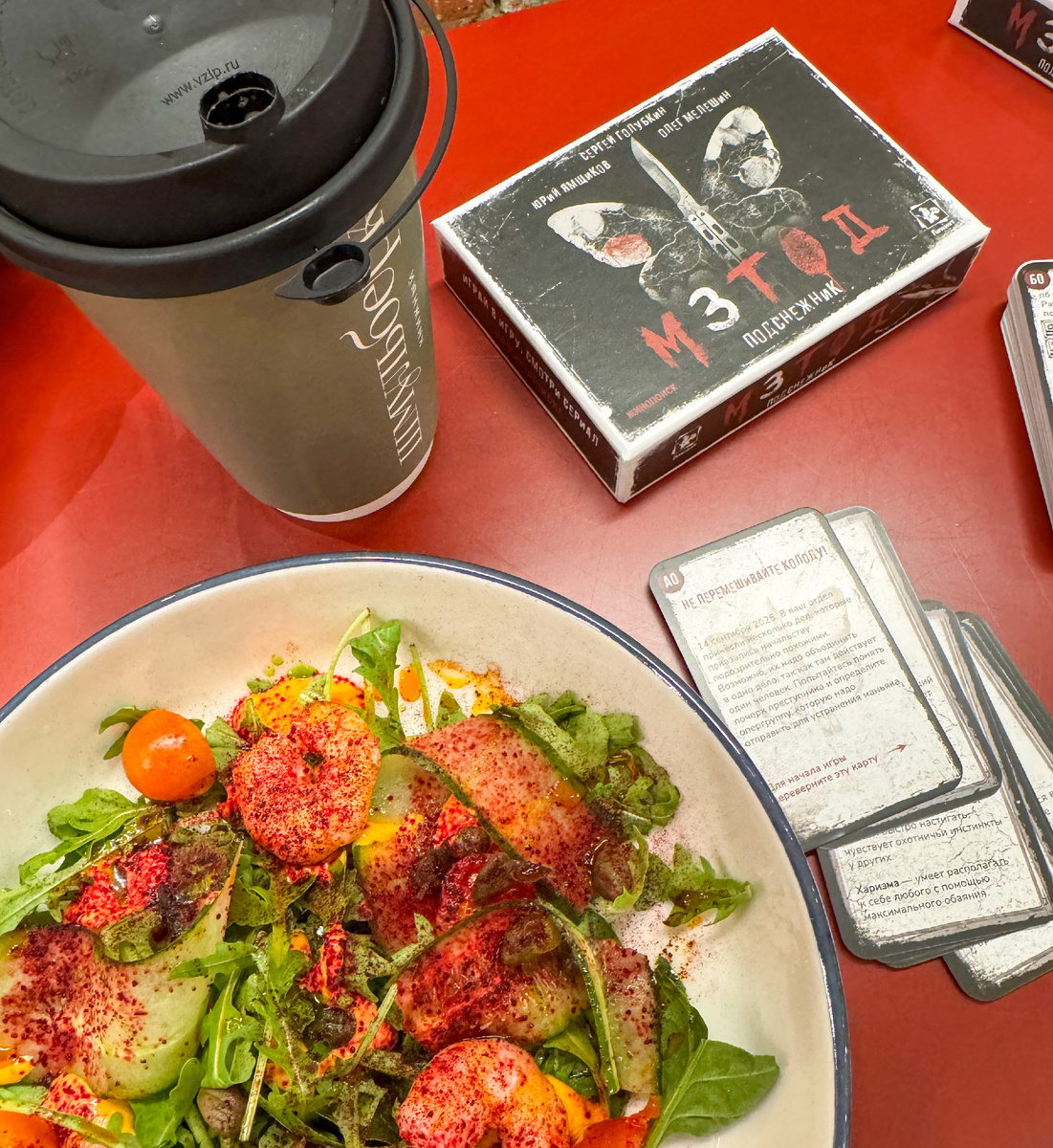 Но вот закончить кафешную посиделку нам хотелось на хорошей ноте, а не на такой игре, каким бы увлекательным ни было расследование, потому что завершать вечер на тяжёлых мыслях не хотелось: зла и чернухи в мире и так с лихвой — поэтому мы под конец сыграли ещё в простую карточную игру:)